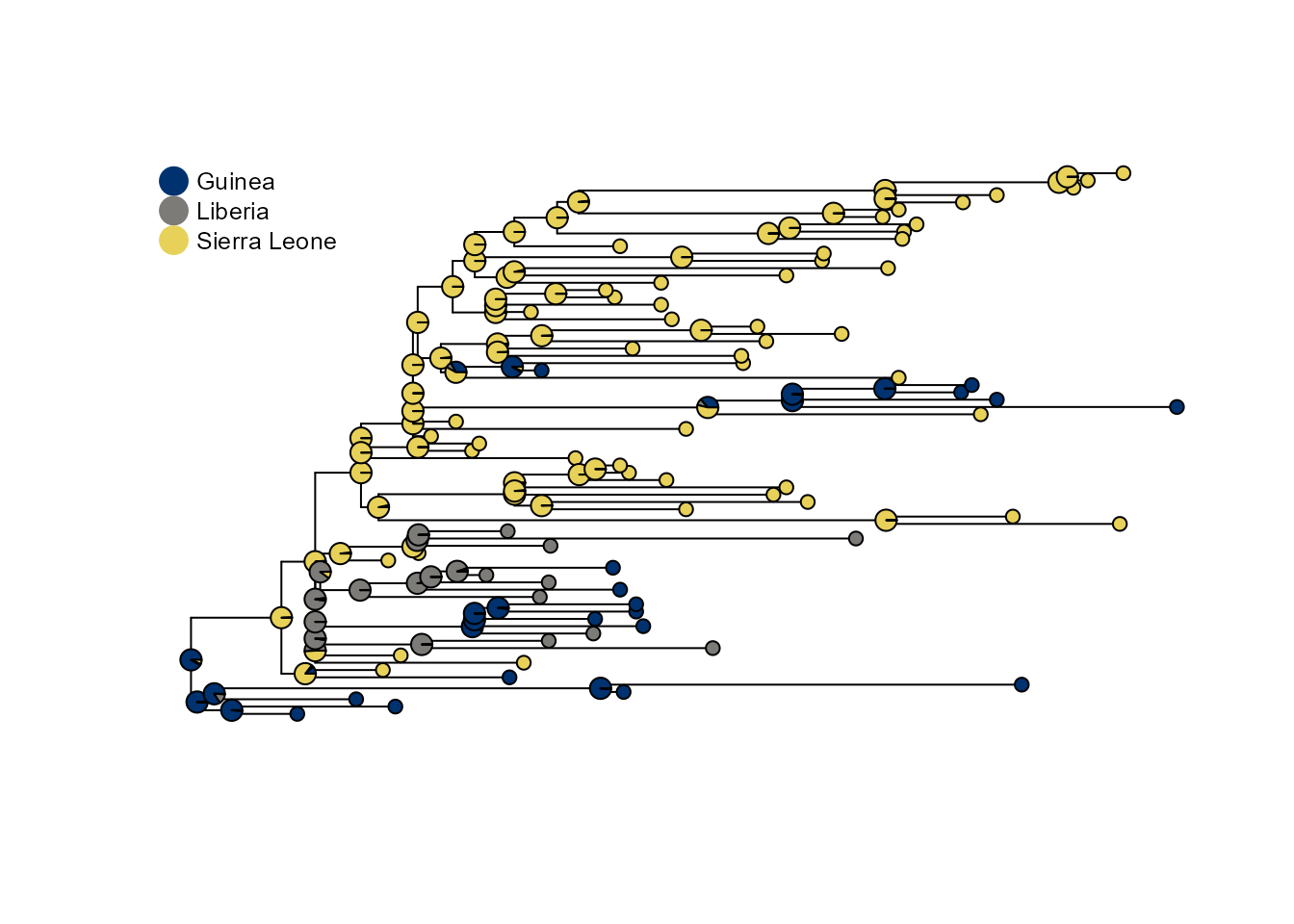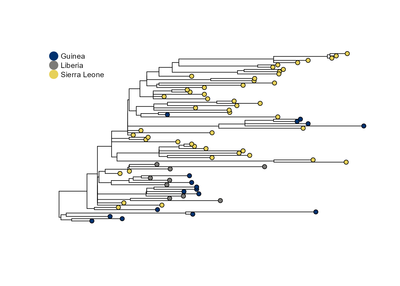 For this example, we use data from Nextstrain (Hadfield et al. 2018; Sagulenko, Puller, and Neher 2018): https://nextstrain.org/ebola/ebov-2013?c=country.