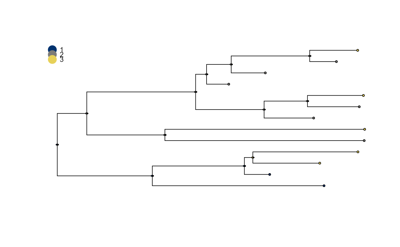 plot_saasi() plots a phylogenetic tree annoted with saasi() output. Tips are annotated with their states.